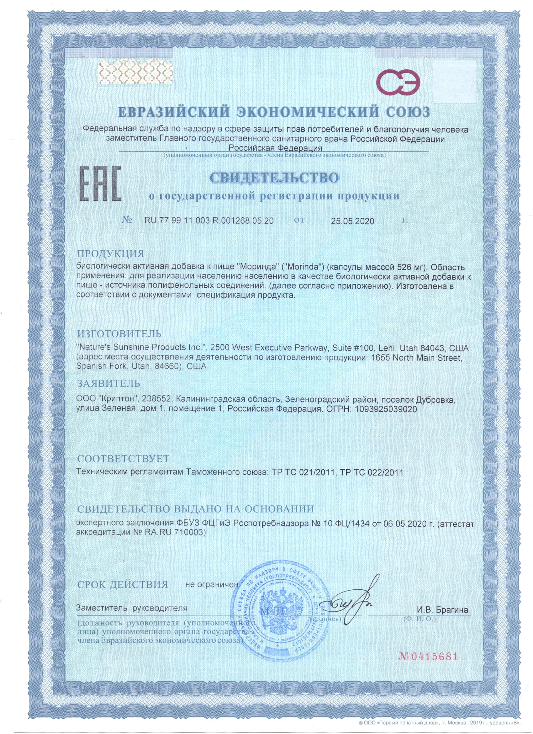 1 капсула содержит: моринда лимоннолистная (плод) (Morinda citrifolia) - 426 мг.