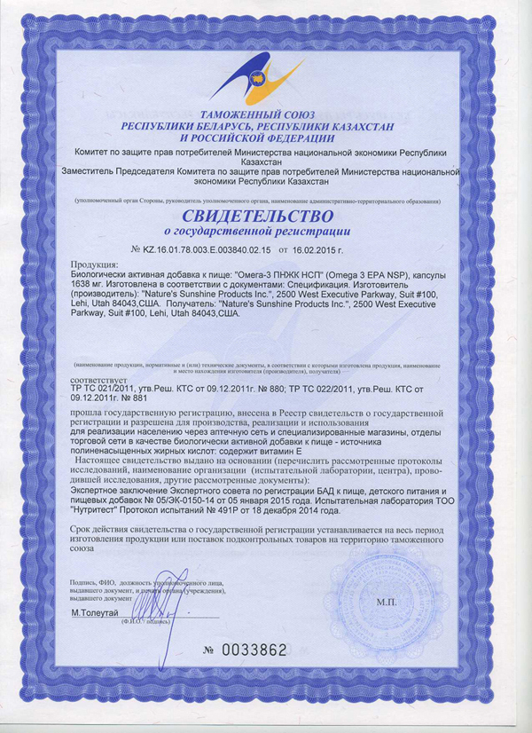 Омега-3 ПНЖК – семейство полиненасыщенных жирных кислот (ПНЖК), которые не образуются в организме человека, являются незаменимыми и должны поступать с животной и растительной пищей. Высшие жирные кислоты этого семейства: эйкозапентаеновая кислота (ЭПК) и докозагексаеновая кислота (ДГК), являются важным строительным материалом мембран нервных клеток и нервных волокон, сетчатки глаза, из них в организме образуются биорегуляторы – простагландины и лейкотриены. α-линоленовая кислота, из которой в организме человека синтезируются ЭПК и ДГК, содержится в льняном (44-61%), рыжиковом (35-39%), горчичном (14%) масле. Однако из неё образуется лишь 10% ЭПК и около 1% ДГК. Поэтому высшие жирные кислоты омега-3 нужно получать из продуктов животного происхождения. Особенно много их находится в жире рыб, обитающих преимущественно в холодных морях (лосось, сардины, сельдь, анчоусы, скумбрия – именно эти сорта использует компания NSP для производства своих Омега-3 ПНЖК).Имеет сертификат программы Всемирной Организации Устойчивого Развития, направленной на защиту водной среды обитания "Друзья моря". Это означает, что рыбий жир в Омега-3 от NSP производится из экологически чистых источников