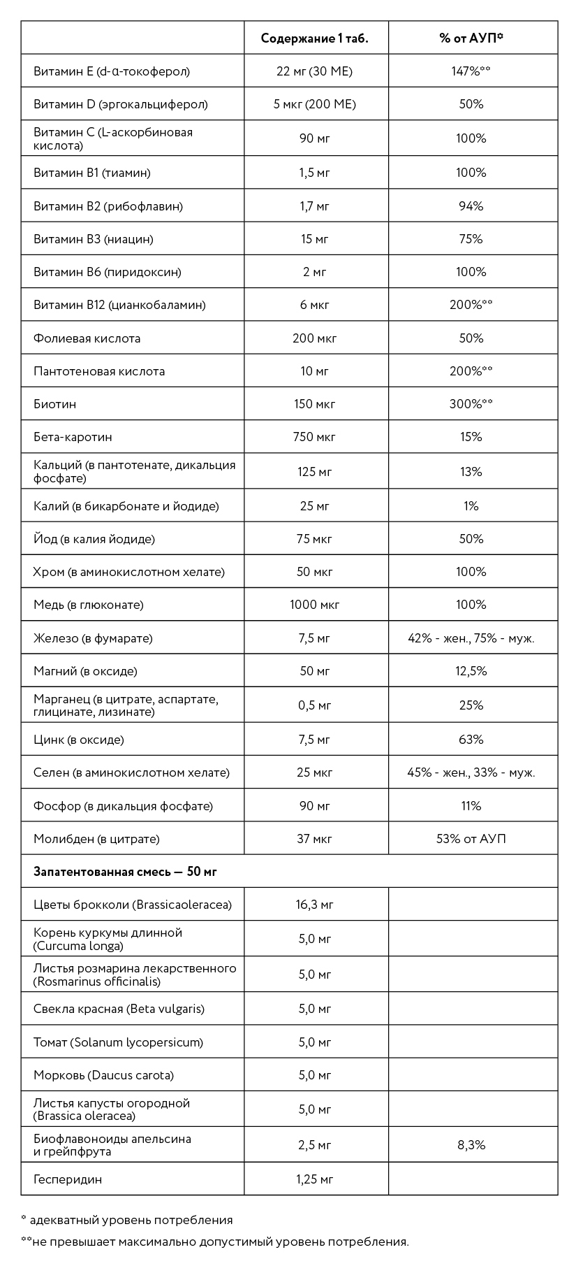 Уникальная витамино-минеральная формула включает фитоингредиенты и биофлавоноиды, усиливающие действие комплекса. Витамины и биоэлементы находятся в легкоусваиваемой форме.