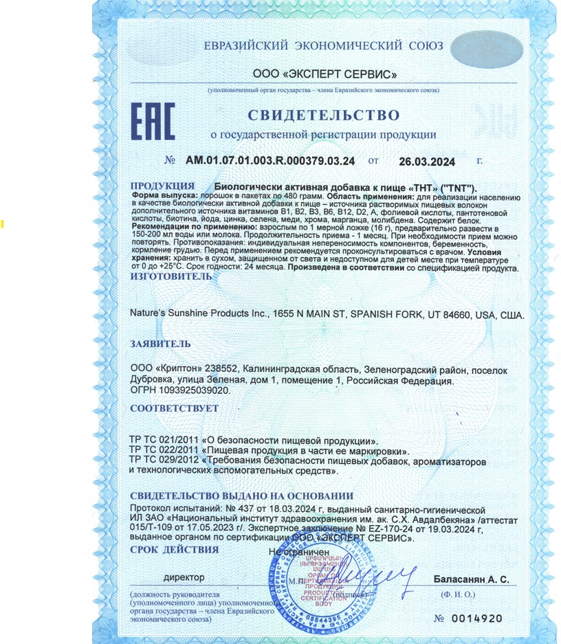БАД «ТНТ» является источником растворимых пищевых волокон, витаминов B1, B2, B3, B6, B12, D2, А, фолиевой кислоты, пантотеновой кислоты, биотина, йода, цинка, селена, меди, хрома, марганца, молибдена. Содержит белок.